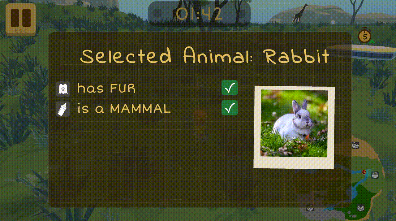 While I was mostly a UI programmer in this project, I did have a hand in coding some game mechanics that were related to the UI, such as the Timer and showing the player whether they selected the correct animal based on the given properties.